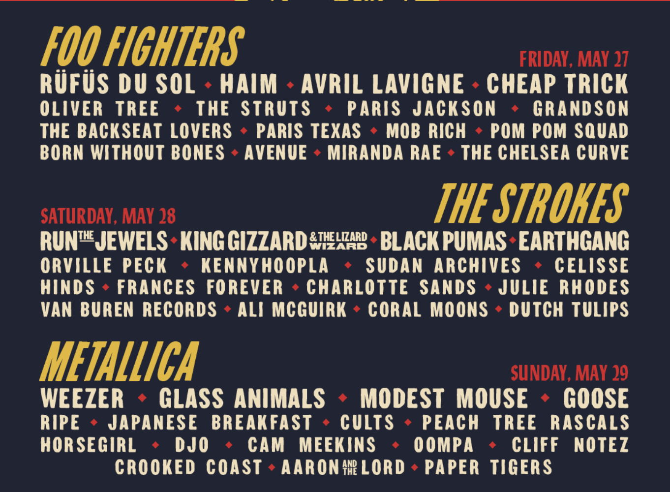 Rage Against the Machine, who were previously headlining the show, will not be making an appearance this year at the festival due to scheduling conflicts. But don’t worry! The band Metallica will now take their place. The three headliners include: Metallica, already mentioned, The Strokes, and Foo Fighters. Haim, Black Pumas, and Glass Animals remain scheduled to make an appearance.