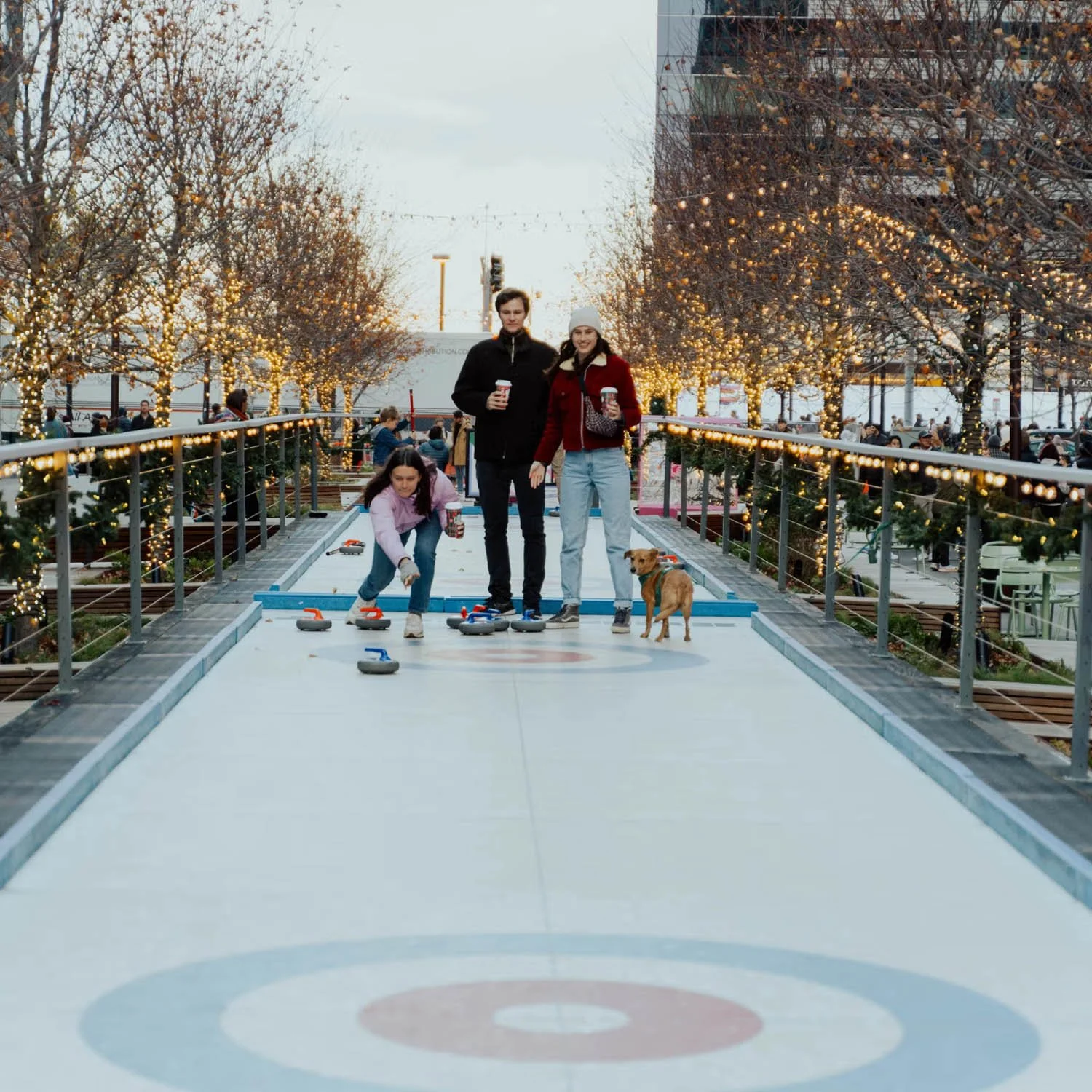The Snowport Curling Lanes on Harbor Way (next to Taiyaki NYC) are open through February, completely free, and perfect for both first-timers and friend groups looking for something new.