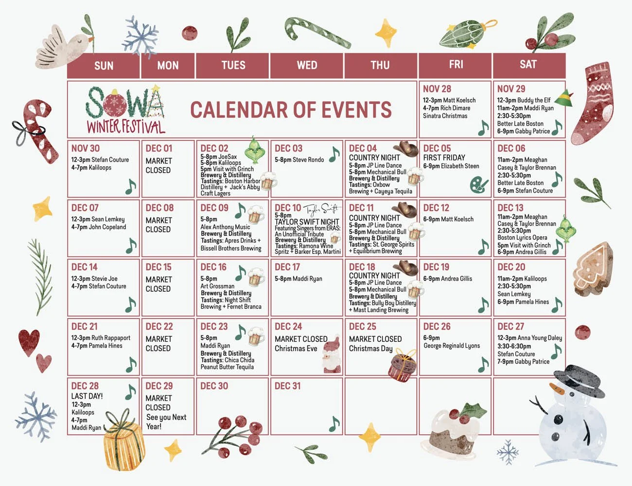 This event has become a holiday tradition for thousands of local shoppers because it blends everything people love about the season. It is festive, creative, warm, and filled with local character. Whether you’re picking up gifts, grabbing a holiday drink, or just exploring the South End, SoWa is a perfect December outing.