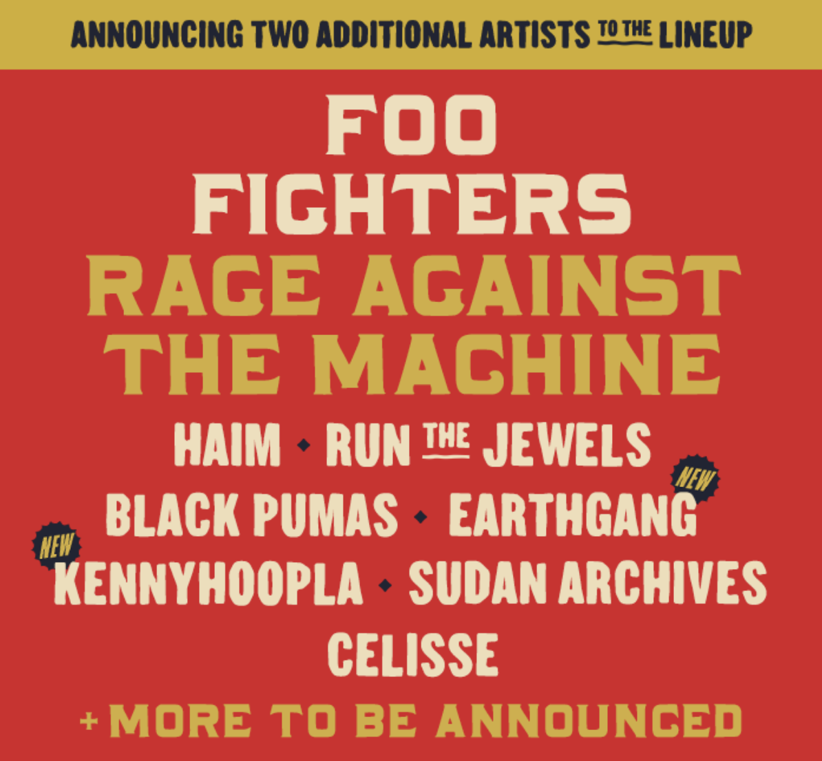 Some bands have been recently announced including HAIM, Foo Fighters, Black Pumas, Rage Against the Machine, Run the Jewels, Sudan Archives, and Celisse. More artists will be announced as the date of the festival approaches. We will post updates on this post and add the artists as the year advances.